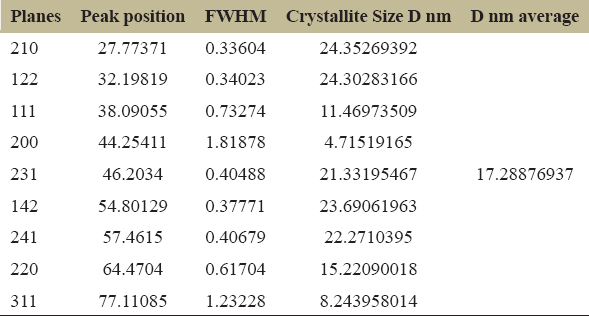 | Planes | Peak position | FWHM | Crystallite Size D nm | D nm average |