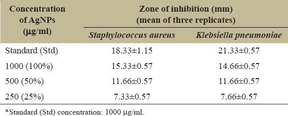 The antibacterial efficacy of AgNPs was analyzed against laboratory control strains of the microbial type cultures (MTCC) obtained from IMTECH Chandigarh. The antibacterial activity was investigated against the Gram-positive bacteria Staphylococcus aureus MTCC (3160) and Klebsiella pneumoniae MTCC (7407), the Gram-negative bacteria. The bacterial suspension of 18 h grown strains was swabbed on the MHA plates using a cotton swab and allowed to solidify. The wells were made by the sterile borer and filled with 50 mL of AgNPs at three different concentrations (1000, 500, and 250 mg/mL), here we used DMSO as a blank, and ampicillin as a standard antibacterial drug. The plates were kept and allowed to incubate at 37°C for about 18 h, then the zone of inhibition of each well was analyzed and measured [27].
