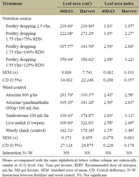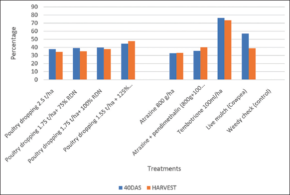 The main plot treatment consisted of four fertilizer treatments, viz-a-viz, (1) poultry dropping applied at 2.5 t/ha, (2) poultry dropping 1.75 t/ha + 75% RDN, (3) poultry dropping 1.75 t/ha + 100% RDN, and (4) poultry dropping 1.5 t/ha + 125% RDN. The five weed control treatments used in the sub-plots were atrazine applied at 800 g/ha, atrazine at 800 g/ha + pendimethalin 100 mL/ha, and tembotrione at 100 mL/ha PoE, live mulch (cowpea), and weedy check.