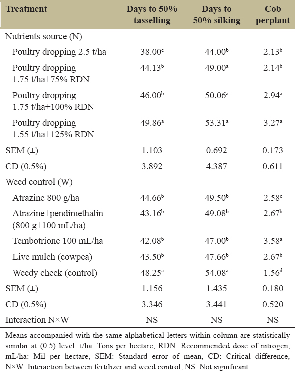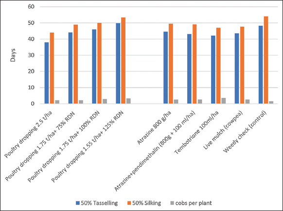 The influence of fertilizer treatments on days to 50% tasselling was significant where application of poultry dropping at 1.55 t/ha + 125% RDN resulted in delayed tasselling while plants in the plots that received 2.5 t/ha of poultry dropping had shorter number of days to 50% tasselling [Figure 3]. Likewise, a similar trend was observed on days to 50% silking. The interaction between the factors was not significant [Table 3].