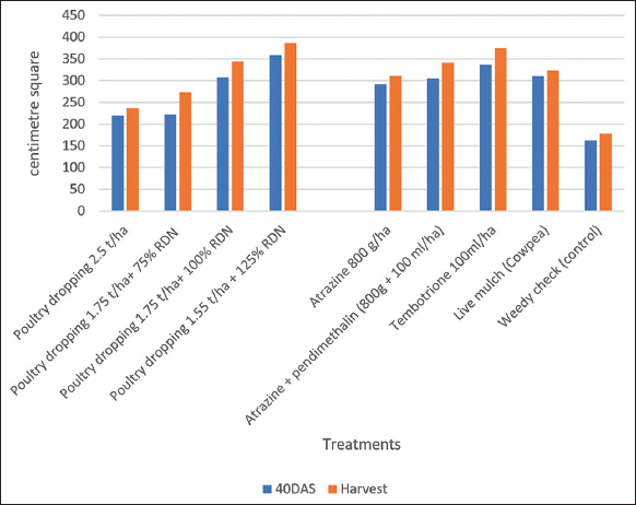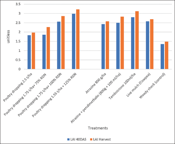 Leaf area and leaf area index were affected by the fertilizer treatments at all the stages of sampling, in which combined application of poultry dropping at 1.55 t/ha + 125% RDN produced the highest leaf area and index accompanied by poultry dropping at 1.75 t/ha + 100% RDN, poultry dropping at 1.75 t/ha + 75% RDN, and the least mean value was recorded in the poultry dropping at 2.5 t/ha [Figure 4]. In weed control treatments, tembotrione applied at 100 mL/ha PoE consistently produced the highest leaf area and index at both sampling stages, while the weedy check produced the least mean value. The interaction between the factors was not significant at both sampling stages [Figure 5].