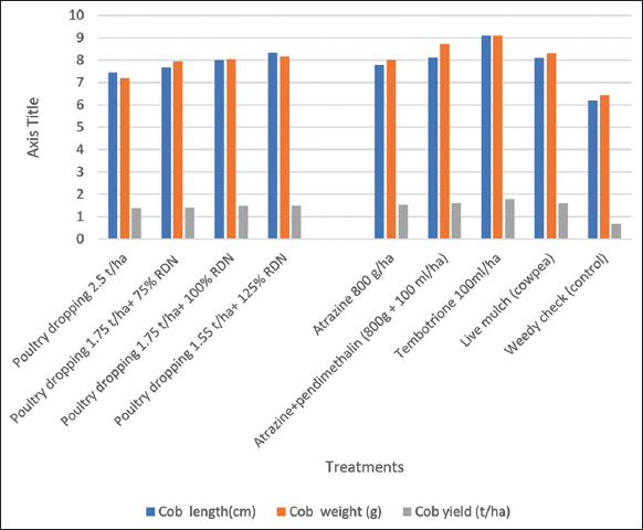 Plot treated poultry manure 1.5 t/ha + 125% RDN registered heavier cobs that were statistically similar with poultry manure 1.75 t/ha + 100% RDN but significantly higher than poultry manure 1.75 t/ha + 75% RDN and poultry manure 2.5 t/ha [Figure 6]. Weed control also affected cob weight, in which post-emergence application of tembotrione 100 mL/ha produced significantly higher value followed by atrazine 800 g/ha + pendimethalin 100 mL/ha that was comparable with live mulch but significantly higher than atrazine 800 g/ha and weedy check. Like-wise a comparable trend was observed in the cobs per plant [Table 4].