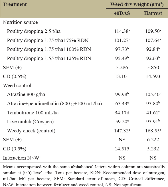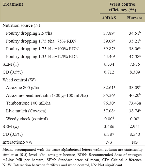 Weed control efficiency was also significant due to application of fertilizer treatment all the sampling periods. Combined application of poultry dropping and recommended dose of nitrogen at different doses recorded the highest weed control efficiency over the poultry dropping alone at 40 DAS and harvest [Figure 2]. In weed control treatments, application of atrazine at 800 g/ha + pendimethalin at 100 mL/ha registered highest weed control efficiency at 40 DAS. At other sampling periods, post-emergence application of tembotrione at 100 mL/ha consistently recorded the highest weed control efficiency and weedy check had the lowest mean value [Table 2].