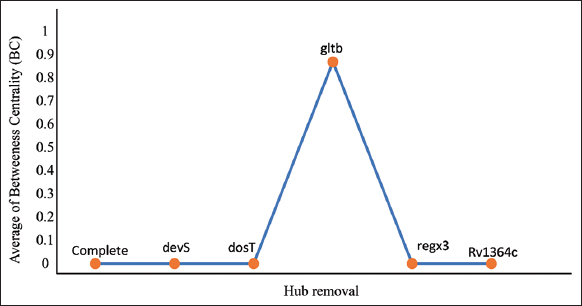 | Figure 3: The representation of the network property comparison of average betweenness centrality (BC) of complete MtrAB-PPIN and after the removal of hubs. [Click here to view] |