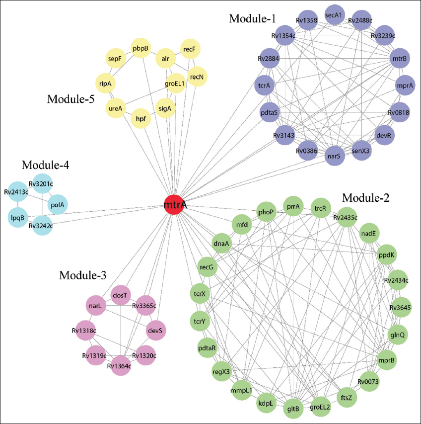 | Figure 5: Cross-talk among the five modules and MtrA hub in the network. MtrA protein interacts with all the modules and hub-interacting nodes were connected via its edges. [Click here to view] |