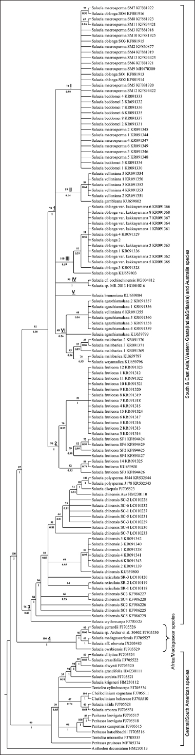 SC from Karnataka, Kerala, and Australia was found in Subclade B, as were SR, S. disepala, and S. erythrocarpa. Salacia sp. (SAD2014S.ka1), S. macrophylla, Salacia sp. (MR2013), and S. kraussii create polytomies at the clade’s base. S. aff obovata, S. madagascariensis, Salacia sp. (Archer et al. 30402), S. gerrardii, S. owabiensis, and east Africa (Zambia and Mozambique) species S. rehmannii and S. bussei have high support values in sub-clade C. The NWC formed into a paraphyletic group that included all of the species from Central and South America. Within this primary clade, however, samples from West Africa Cameroon-S. lehmbachii, Ivory Coast-S. nitida, and SEA SC (TT2016003 and TT2016013), Thailand, Salacia sp. (HO2013041), Salacia sp. (SH-2010), and S. arborea from Indonesia were nested.