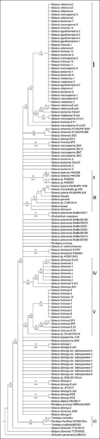 In the rbcL phylogeny, species resolution was low with very weak BS, and PP support was seen within the cladogram The samples from Karnataka and Kerala were significantly discordantly dispersed in Clade I. SM, SA, SB, SO, SV, and SMa were assigned a low BS, but a high PP. Karnataka’s Western Ghats samples Salacia species from Kerala and Africa were sister taxa to SC, SM, SO, and SF. Salacia species from Africa formed two different clades in Clades II and III, with S. macrophylla and Salacia species from Thailand and China, nested within one of the clades [Figure 3]. Clades IV and V contained samples from Kerala and were different clades of SC and SF. Tontelea micrantha, Peritassa flaviflora, and Tontelea ovalifolia formed a distinct clade (Clade VI) with good support values.
