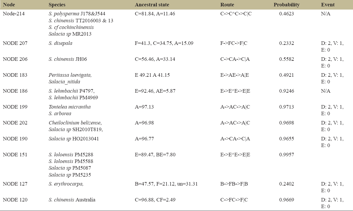 Table 2: Details of ancestral state, route, probability of some of the Salacia species.