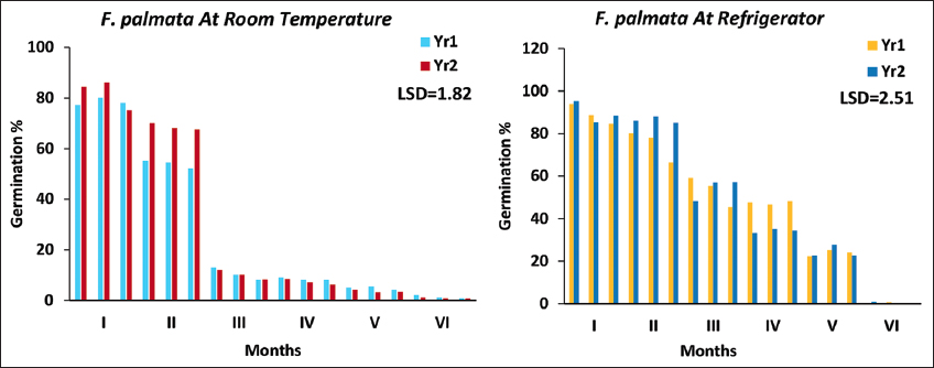 For viability retention seeds of F. palmata collected at maturity were stored under two conditions in airtight plastic containers placed at room temperature (during day18–26°C and night 3–13°C) and refrigerator (1 and 3°C) [1]. The viability was checked by germinating 3 replicates of 100 seeds every 30 days up to the time seeds germinated (in both year-1 and year-2) [19].