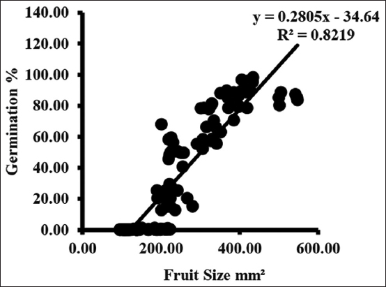 In both the years, the fruit size between initial to the final collection was 103.13 ± 5.37 and 409.52 ± 5.27mm2 throughout collection change in fruit size was 306.39 mm2, and the seed size between initial to the final collection was 0.81 ± 0.04 and 3.00 ± 0.04 throughout collection change in seed size was 2.19 mm2 at (S1). The fruit size between initial to the final collection was 111.78 ± 1.48 and 413.47 ± 9.84 mm2 over the period of collection change in fruit size was 301.69 mm2, and seed size between initial to the final collection was 0.60 ± 0.03 and 2.79 ± 0.12 over the period of collection change in seed size was 2.19 mm2 at (S2). The fruit size between initial to final collection was 106.41 ± 4.07 and 502.26 ± 1.53 mm2 over the period of collection change in fruit size was 395.85 mm2 and seed size between initial to final collection was 1.00 ± 0.05 and 2.44 ± 0.04 over the period of collection change in seed size was 1.44 mm2 at (S3).