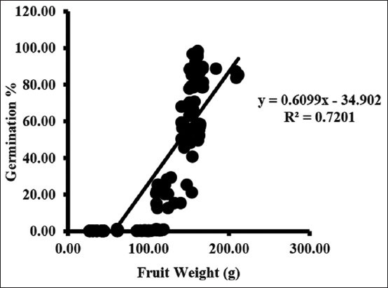 The species produced flowers/fruits twice in the year, Mar-May and Oct-Dec. However, only the data for the period between March and May has been presented. As the fruits from October to December produced non-viable seeds which failed to germinate. Fruit collection was started from the 2nd week of April up to the availability of fruits from marked trees for all three sites at week intervals. Fruits were collected at 1-week intervals directly from the selected trees. Fruits from all trees were combined at one collection date to create a composite sample. Fruits were manually de-pulped to extract seeds. Three replicates of 25 fruits/seeds were taken from the composite sample to determine the different morphological characters of fruits/seeds (size, color, and fresh weight). Fruit and seed weight (100 fruits/seeds) was measured by electronic balance (Model No. PGB 301 accuracy + 0.001 mg Wensar), and fruit and seed size (25 fruits/seeds) were expressed in mm² (length and width) was estimated using (Model No. CD-6” accuracy + 0.02 mm Mitutoyo Co.) digital Vernier caliper. Moisture content% was estimated based on three replicates of fruits and seeds (25) each and assessed on a fresh weight basis by drying at 103 ± 2°C for 16 ± 1 h and then the samples were reweighted according to [15,16]. For germination four replicates of hundred seeds were kept at the top of germination paper in petri-dishes at room temperature. The appearance of the first radicle germination was considered to have started and was studied for 40 days, following [17], the seed germination% was calculated.