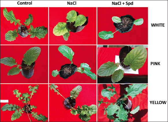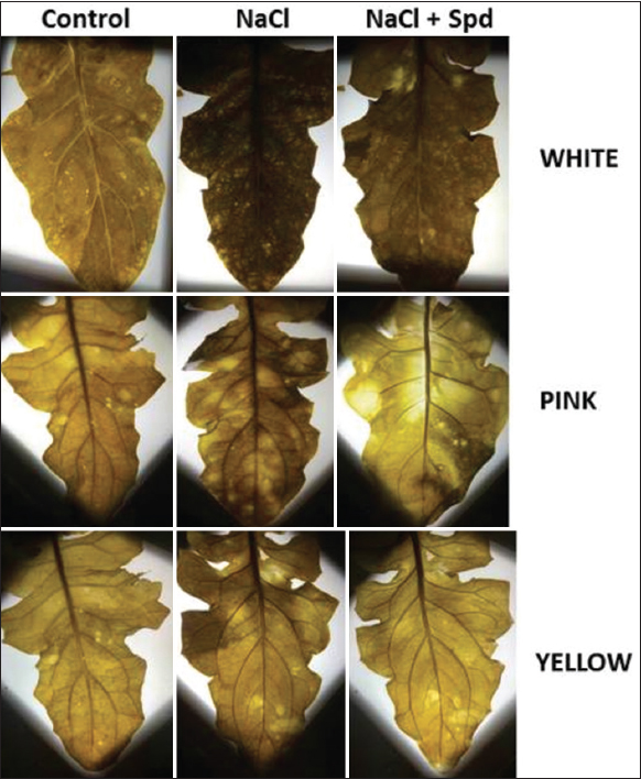 The morphological results of NaCl stress in plants can be noticed by subjecting the leaves to DAB staining. During salinity stress, several ROS burst out in the aerial parts of plants like leaves and damage their pigment complexes. Thus due to staining by DAB, dark brown color indicating high increases in H2O2 content can be seen in salt-affected seedlings. This over accumulation of ROS (H2O2 in particular) indicates increased lipid peroxidation thereby reducing the integrity of cell membranes leading to ion leakage. Exogenous PAs like Spd mitigate the negative effects of ROS accumulation in the leaves. H2O2 staining is seen in leaves of all the three genotypes when treated with NaCl as brown patches which was more prominent in white followed by pink and yellow [Figure 2]. With the exogenous supplementation of Spd, accumulation of ROS in leaves was decreased across all three genotypes as indicated by reduced browning.