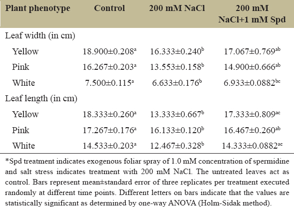 A noticeable difference in leaf length and width was noticed across three genotypes of G. jamesonii [Table 1]. On NaCl treatment, we noticed decrease in the leaf length and leaf width of all three genotypes which was particularly high in white. Exposure of these treated plants to Spd showed a marginal improvement in leaf size in comparison to control.