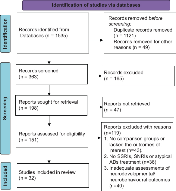 Database searches retrieved 1535 citations. Removal of duplicates followed by review of titles abstracts and full texts yielded 32 relevant studies reporting neurodevelopment and neurobehavioral outcomes following exposure to second-generation antidepressant compared to control/untreated group. The number of titles, abstracts, and full papers excluded is shown in the PRISMA flow chart [Figure 1]. Table 2 contains comprehensive information on the research, including study size, exposure, exposure period, doses range, and results for neurodevelopmental and neurobehavioral outcomes.