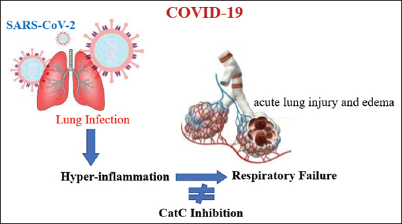 Maladaptive cytokine release occurs in COVID-19 patients in response to infection and other stimuli. The development and progression of ARDS inflammation are closely correlated with this cytokine storm event. The pathogenesis is complicated, but one aspect is the loss of local and systemic regulatory control over the production of pro-inflammatory cytokines [71,72]. A growing problem for intensive care units due to the COVID-19 pandemic is ARDS, characterized by diffuse alveolar inflammation. Neutrophils may play a role in this. Neutrophil proteases associated with elastase may be eliminated to slow the development of lung damage in patients [21]. As a major inflammatory response to endothelial injury components, neutrophils have proteolytic and pro-apoptotic properties through several enzymes, including serine proteases and NE [73]. Pharmacological CatC inhibition is a potential therapeutic strategy to halt irreversible pulmonary failure putting the lives of COVID-19 patients in danger [21,71]. The pharmacological mechanism of action of CatC inhibition is illustrated in Figure 2.