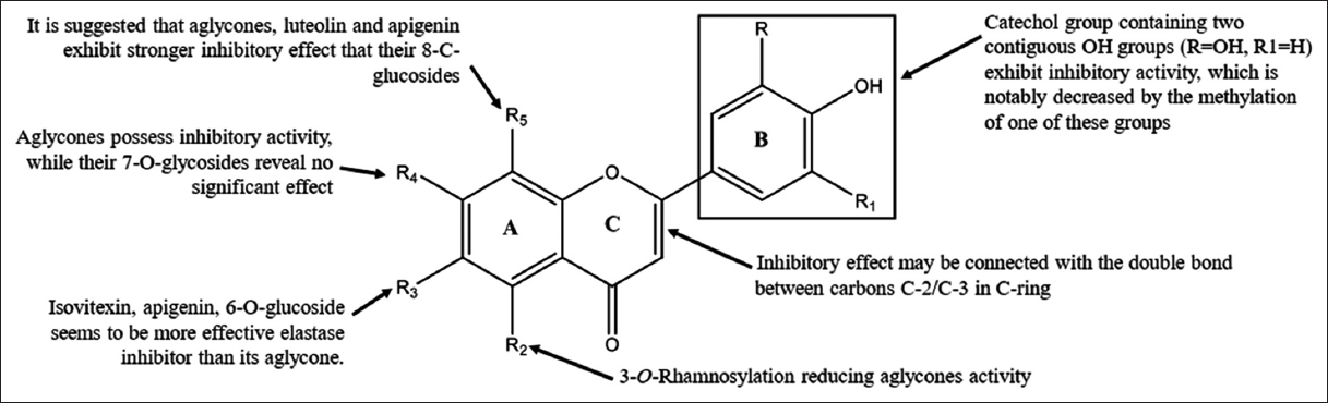 Exploration of natural products, mainly plants, has become a research target as a potential source of an efficient elastase inhibitor. However, it is still limited to exploring the potential of elastase inhibitors in vitro and in vivo [87]. On the other hand, the previous studies investigating the inhibition of HNE by secondary metabolites did not include a detailed kinetic characterization. In addition, there are still few studies on the isolation and determination of the structure of active compounds from natural ingredients that target this vital enzyme. Therefore, some research results on exploring plants as elastase inhibitors are presented in Table 2.