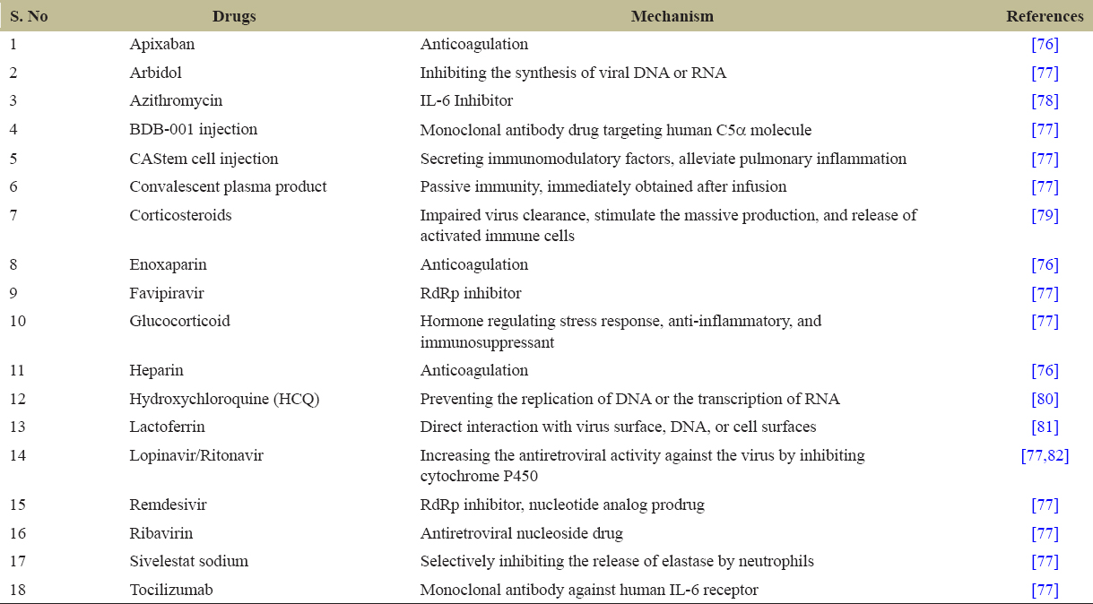 77. Jin Z, Liu JY, Feng R, Ji L, Jin ZL, Li HB. Drug treatment of coronavirus disease 2019 (COVID-19) in China. Eur J Pharmacol 2020;883:173326. [CrossRef]