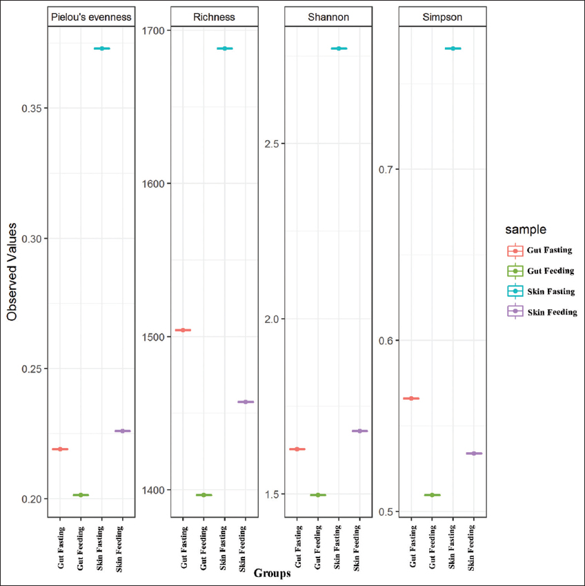 | Figure 1: Alpha diversity indices (Pielou’s evenness, Richness, Shannon and Simpson) for 4 groups of samples (gut fasting, gut feeding, skin-mucus fasting, and skin-mucus feeding). [Click here to view] |