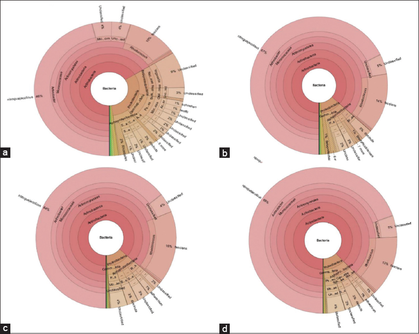 | Figure 2: Krona chart for the taxonomic classification of the bacterial metagenome from Channa striata (a) skin-mucus (starved), (b) Skin-mucus (fed), (c) Gut (starved), and (d) Gut (fed). The inner circle represents higher taxonomic ranks, while more detailed taxonomic ranks (up to genus level) are presented in the outer circles. [Click here to view] |