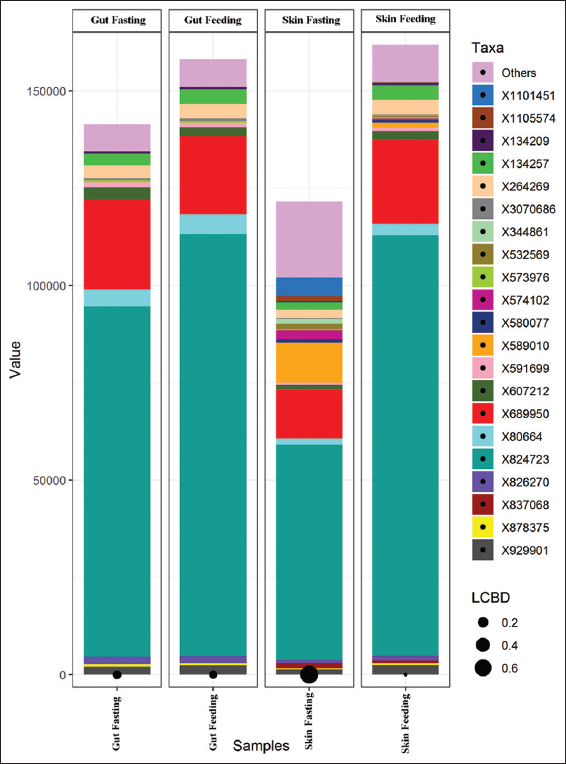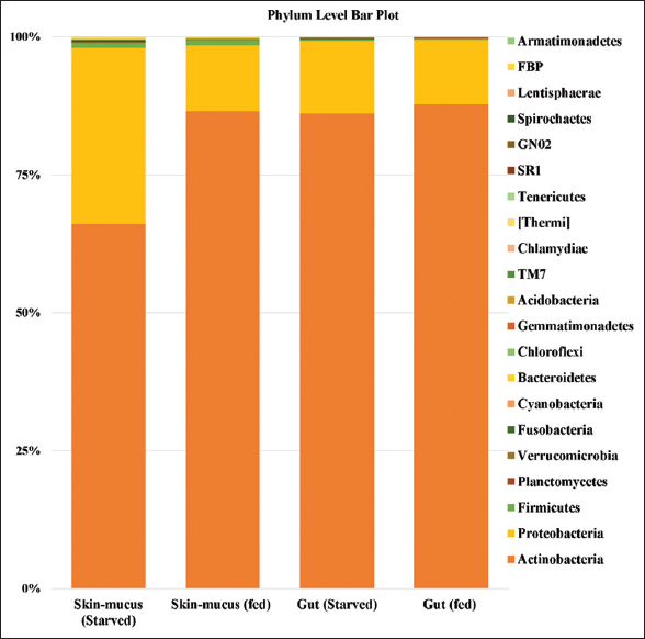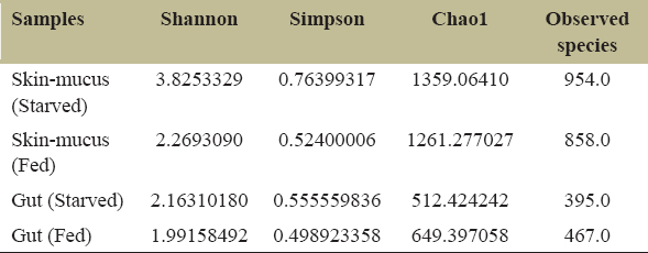 | Figure 3: Taxonomic diversity of gut and skin-mucus microbiome in feeding and fasting conditions. [Click here to view] |
