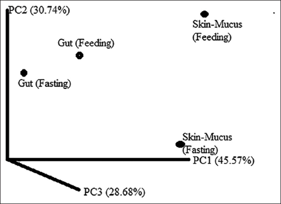 | Figure 6: Principal coordinate analysis plot (PC1 vs PC2) based on unweighted UniFrac distance matrix of four samples (Skin-mucus Fasting, Skin-mucus Feeding, Gut Fasting, and Gut Feeding). [Click here to view] |