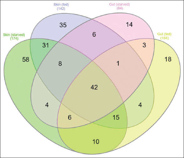 | Category | Skin-mucus (Starved) | Skin-mucus (Fed) | Gut (Starved) | Gut (Fed) |