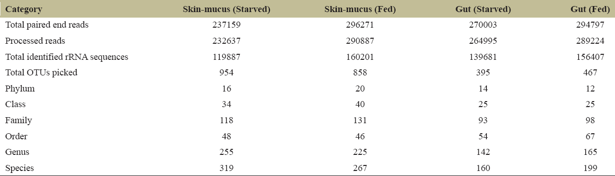 Table 1: Metagenomics read statistics showing total number of paired end and processed reads along with the number of OTUs in each taxonomic rank in the skin-mucus and gut microbiome of starved and fed fish.