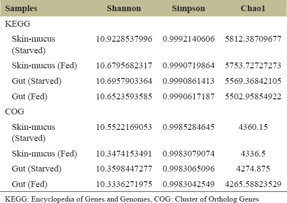 Table 2: Alpha diversity index across various matrices. The alpha diversities in the skin-mucus of starved fishes were highest for all the matrices.