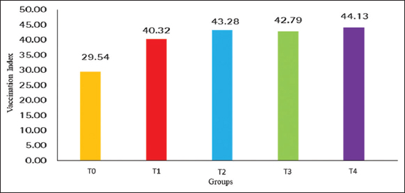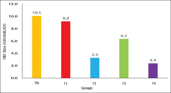 The geometric mean of the ND antibody titer was 10.1, 9.2, 3.3, 6.3, and 2.4 in T0, T1, T2, T3, and T4, respectively [Figure 1]. The IBD vaccination index was 29.54, 40.32, 43.28, 42.79, and 44.13 in Y0, T1, T2, T3, and T4, respectively [Figure 2]. IBD vaccination index increased in all treatment groups when compared to the control group. Treatment SFP had better effects on T- and B-lymphocytes, phagocytic cells, CD+ cells, and other immune organs as an immune modulator than enramycin. Broiler chickens’ overall health is effectively maintained by these, which help boost immunity.