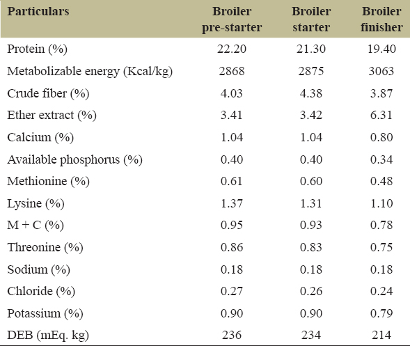 | Particulars | Broiler pre-starter | Broiler starter | Broiler finisher |