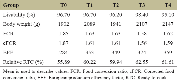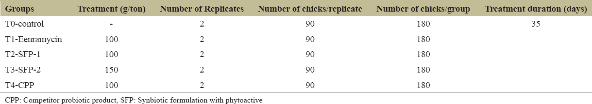 Nine hundred 1-day-old Cobb 430Y broiler chicks were procured from M/s Sriya Farms and Feeds Pvt. Ltd., Kolar, Karnataka, India, and were randomly divided into five groups of T0, T1, T2, T3, and T4, with two replicates of 90 birds each. T0 was raised on regular broiler feed without any AGPs. In contrast, T1, T2, T3, and T4 were raised on regular broiler feed and were simultaneously supplemented per ton of feed with enramycin at 100 g, SFP at 100 g, SFP at 150 g, and competitor probiotic product (CPP) at 100 g [Table 2].