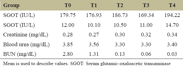 For the determination of biochemical parameters (n = 8), standardized kit-based analysis methods were used. The creatinine was determined by the modified Jaffe method, SGOT, and SGPT by IFCC method, blood urea by the GLDH urease method, BUN by the calculation method. (BUN mg/dl = urea mg/dl x 0. 67).