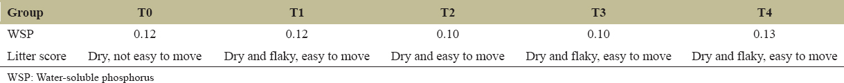 Table 7 shows the effect of SFP on litter characteristics in broiler chickens. The wet litter was not observed in the treatment groups, and WSP was slightly higher in CPP (T4) as compared to control (T0) and other treatment groups, namely enramycin (T1), SFP at 100 g/ton (T2), SFP at 150 g/ton (T3) indicated that supplementation of SFP at 100 g/ton (T2) and SFP at 150 g/ton (T3) was at par with the performance of enramycin (T1), and CPP (T4) in terms of maintaining litter characteristics. Whereas WSP was reduced by 16.67%, 16.67%, and 23.08% following supplementation of SFP at 100 g/ton (T2) and SFP at 150 g/ton (T3) as compared to control (T0), enramycin (T1), and CPP (T4), respectively.