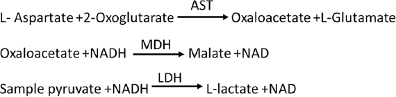 AST catalyzes the transfer of the amino group from L-aspartate to 2-oxoglutarate forming oxaloacetate and L-glutamate. Oxaloacetate in the presence of NADH and MDH is reduced to L-malate. NADH oxidized to NAD. The reaction should be monitored by measuring the rate of decrease in absorbance at 340 nm due to oxidation of NADH to NAD. Lactate dehydrogenase (LDH) was added to reagent to prevent interference from endogenous pyruvate so that it does not interfere with the assay.
