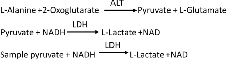 ALT transfers the amino group from alanine to α-oxoglutarate to yield pyruvate and L-glutamate. Pyruvate is reduced to lactate by LDH in reagent with simultaneous oxidation of NADH to NAD. This reaction is monitored by measuring the rate of decrease in absorbance at 340 nm due to NADH oxidation. During initial incubation period to avoid interference during the assay, endogenous pyruvate sample is rapidly and completely reduced by LDH.