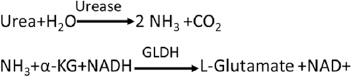 In the reaction, urea is hydrolyzed by urease to ammonia and carbon dioxide. Ammonia combines with α-ketoglutarate to produce L-glutamate in the presence of GLDH and reduced NADH.
